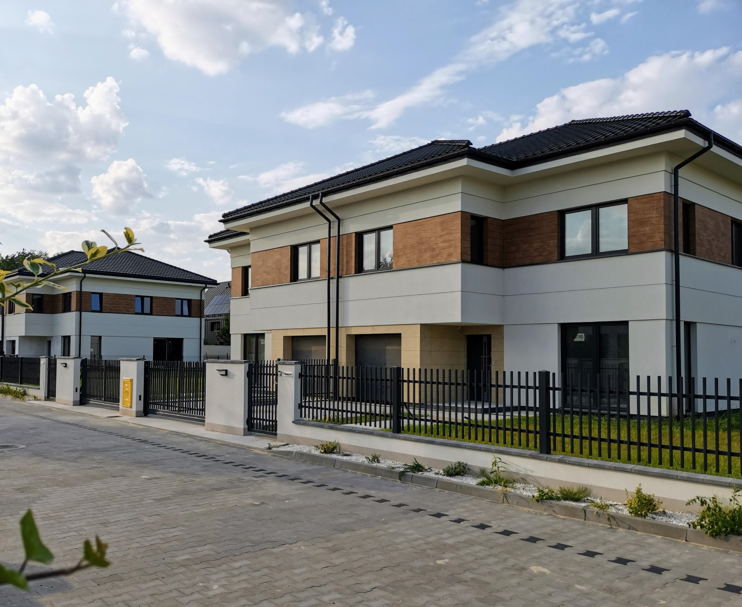 Kompleks pięciu domów w zabudowie dwulokalowej przy prywatnej drodze dojazdowej na skraju ul Wesołej w Michałowicach.