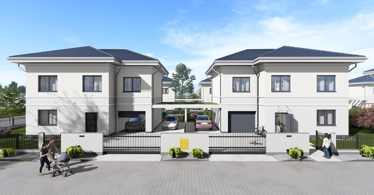 Każdy z domów posadowiony jest na rozłożystej działce, zapewniającej przestrzeń do odpoczynku i zabawy.
